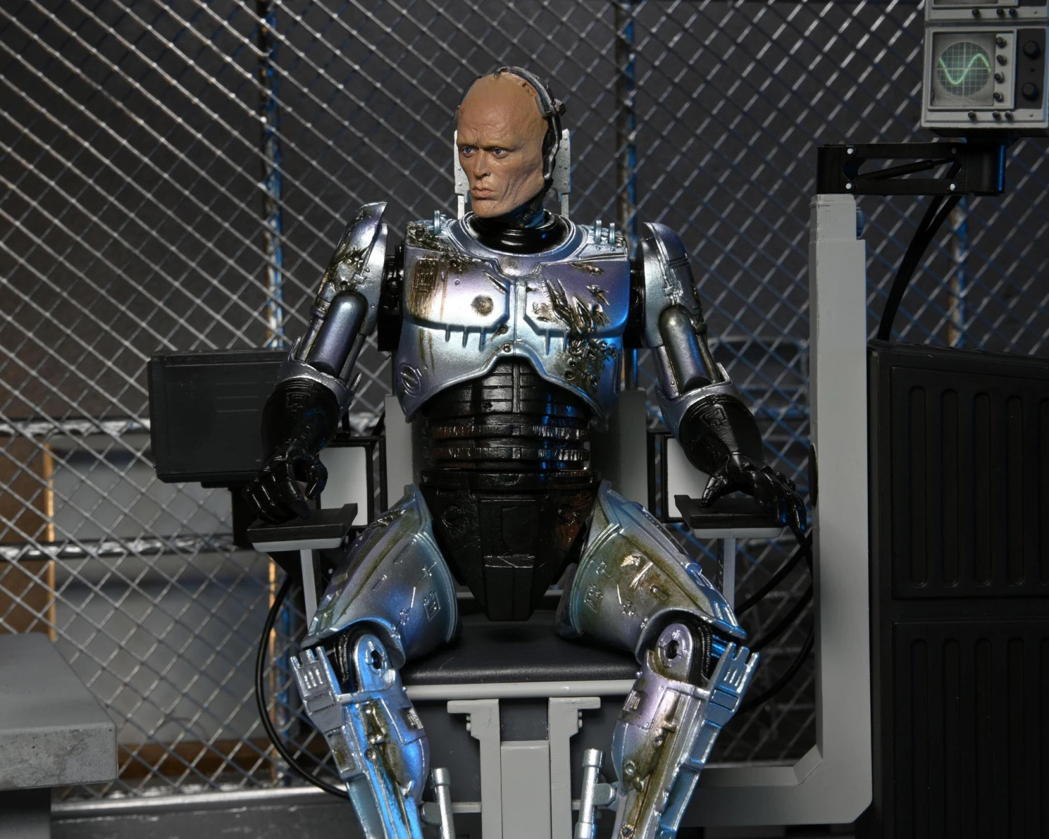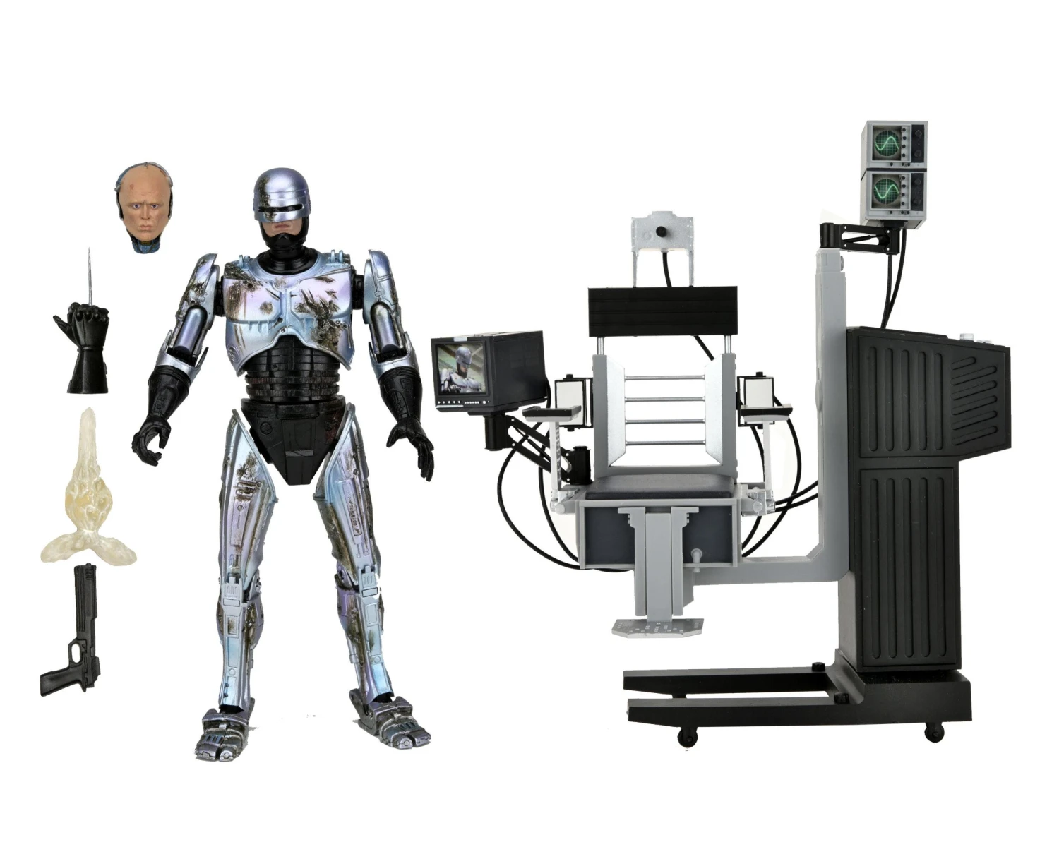 After fighting baddies all day, dock the 7β scale Ultimate Battle-Damaged RoboCop figure in the included screen-accurate chair with movable elements. The chair is over 8″ tall, over 7″ wide, and has swiveling seat as well as articulated swiveling monitors!